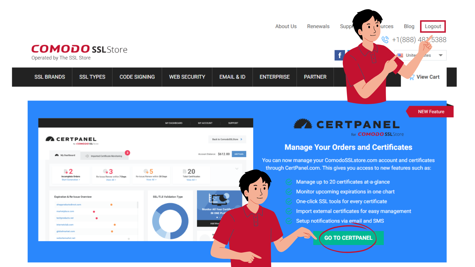 - If you are already logged into your account, you will see the “Log out” button instead. No need to click logout, you can go straight to CertPanel by clicking the “Go to CertPanel” button on the main page of ComodoSSLstore or accessing the link certpanel.com.