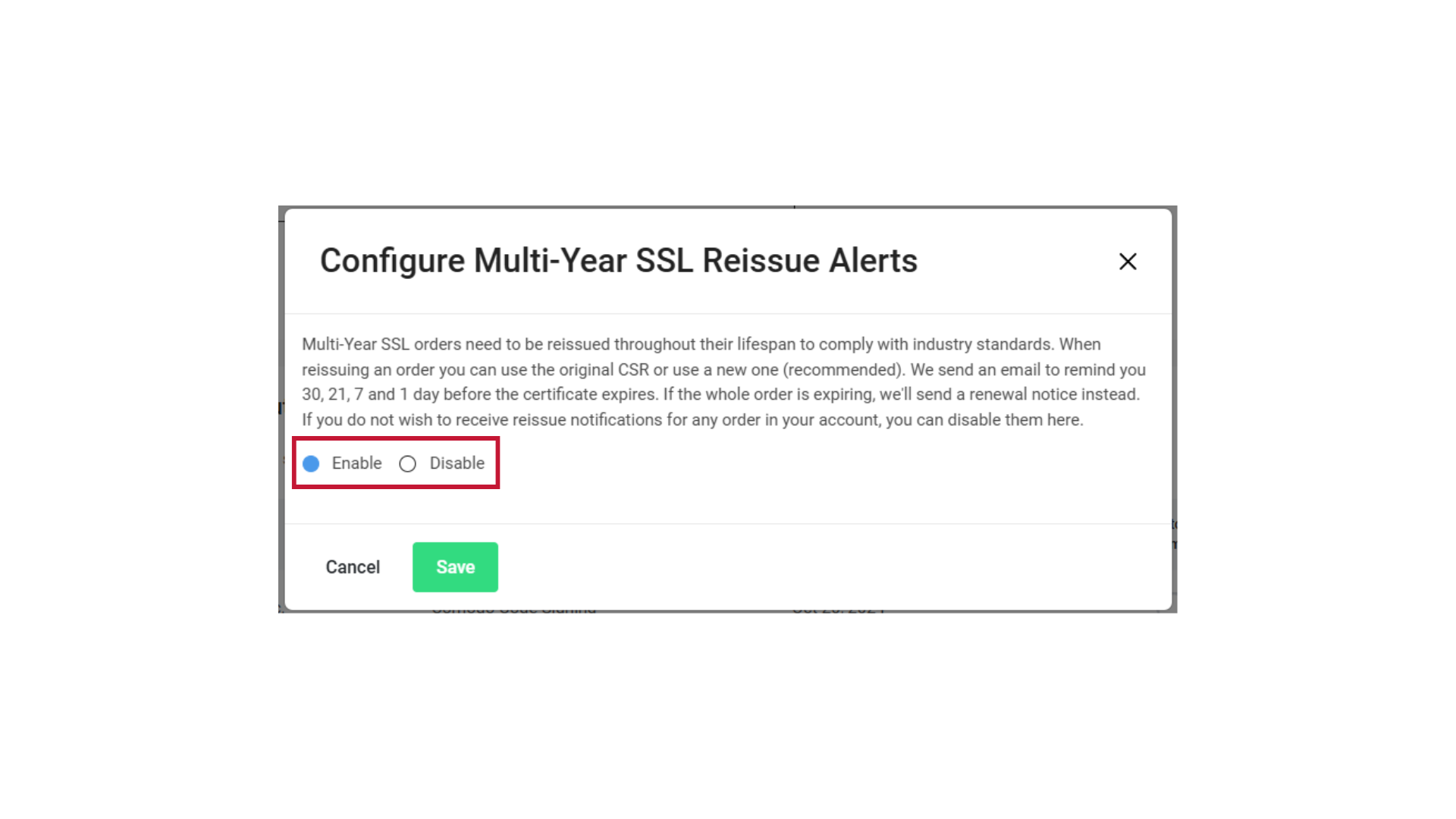 If you bought Multi-Year (Multiple year) SSL certificates, you will need to reissue them on a yearly basis until the certificate needs to be renewed. With this setting, you can opt to enable/disable reissue notifications which sends an email to remind you 30, 21, 7, and 1 day/s before your certificate expires. If your whole order is expiring, you receive a renewal notice instead.